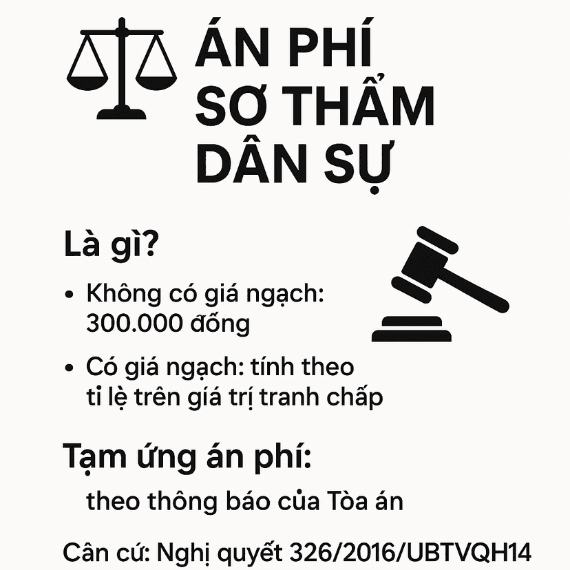 Án phí sơ thẩm là loại án phí được thu khi vụ án được giải quyết tại tòa án cấp sơ thẩm. Án phí sơ thẩm được quy định cụ thể trong từng vụ án dân sự và thường phụ thuộc vào mức độ phức tạp của vụ án, số tiền trong vụ án, và các quy định của pháp luật.